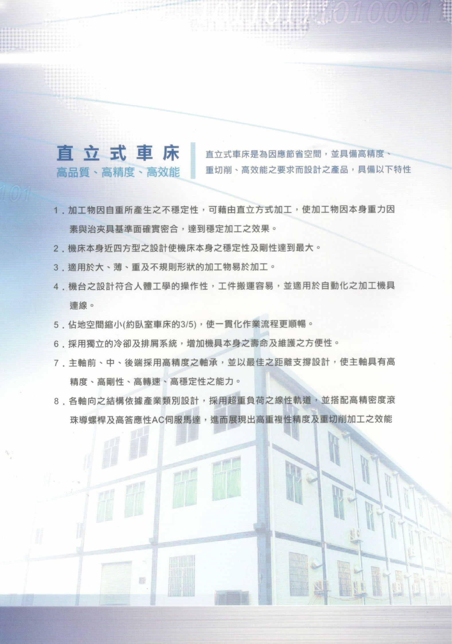 用來加工直徑和重量比較大的工件,主軸軸線垂直於水平面、工件安裝在水準回轉工作臺上的車床,由工作臺帶動作旋轉的主運動,由垂直刀架和側刀架實現進給運動。立式數控車床也用於加工徑向尺寸大而軸向尺寸相對較小,形狀複雜的大型和重型工件。如各種盤,輪和套類工件的圓柱面,端面,圓錐面,圓柱孔,圓錐孔等。亦可借助附加裝置進行車螺紋,車球面,仿形,銑削和磨削等加工。