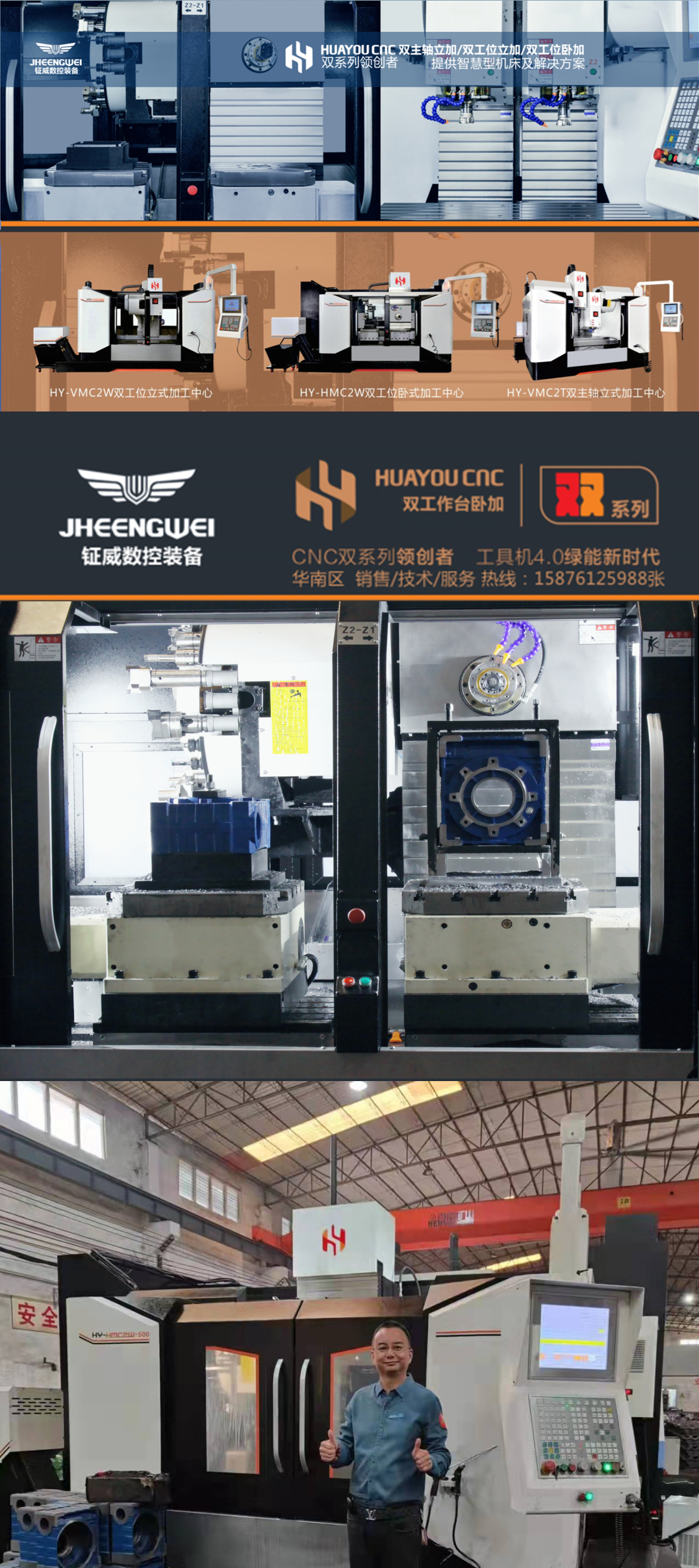 HY-HMC2W-500是一台双工作台双伺服刀库卧式加工中心,采用机电一体化设计,造型美观大方,可进行精密切削。可以自动连续地完成铣、钻、镗、扩、铰、锪、攻丝等多种工序的加工。